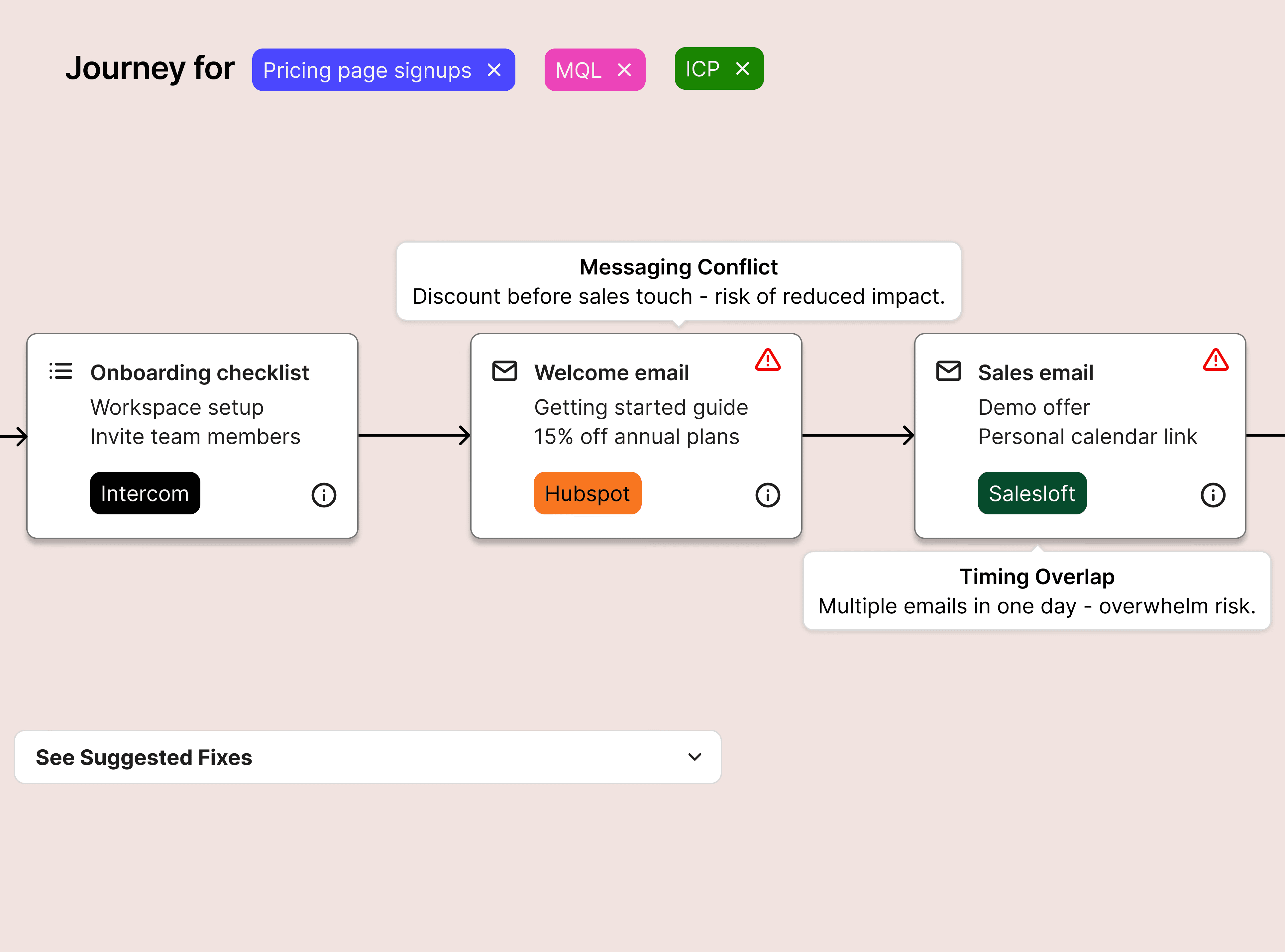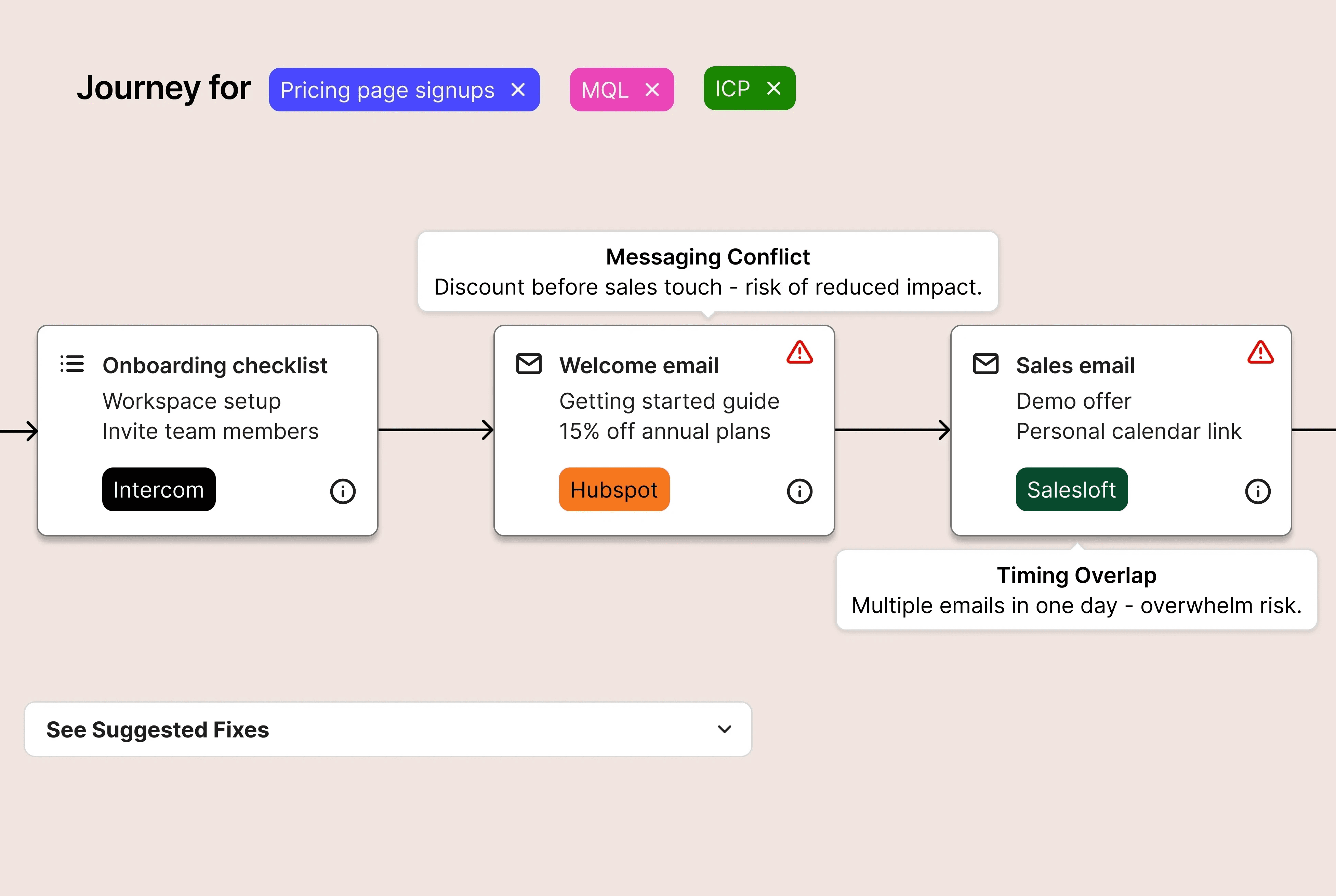 Catch campaign clashes before they kill deals. Touchflow flags overlaps, spam risks, and mixed messages — then suggests AI-powered fixes across copy, timing, and audience to protect engagement and boost conversions.